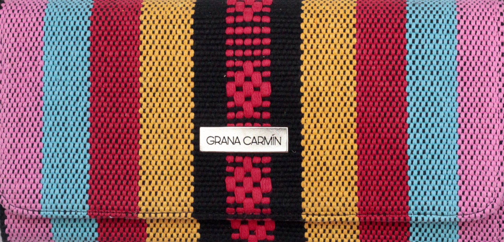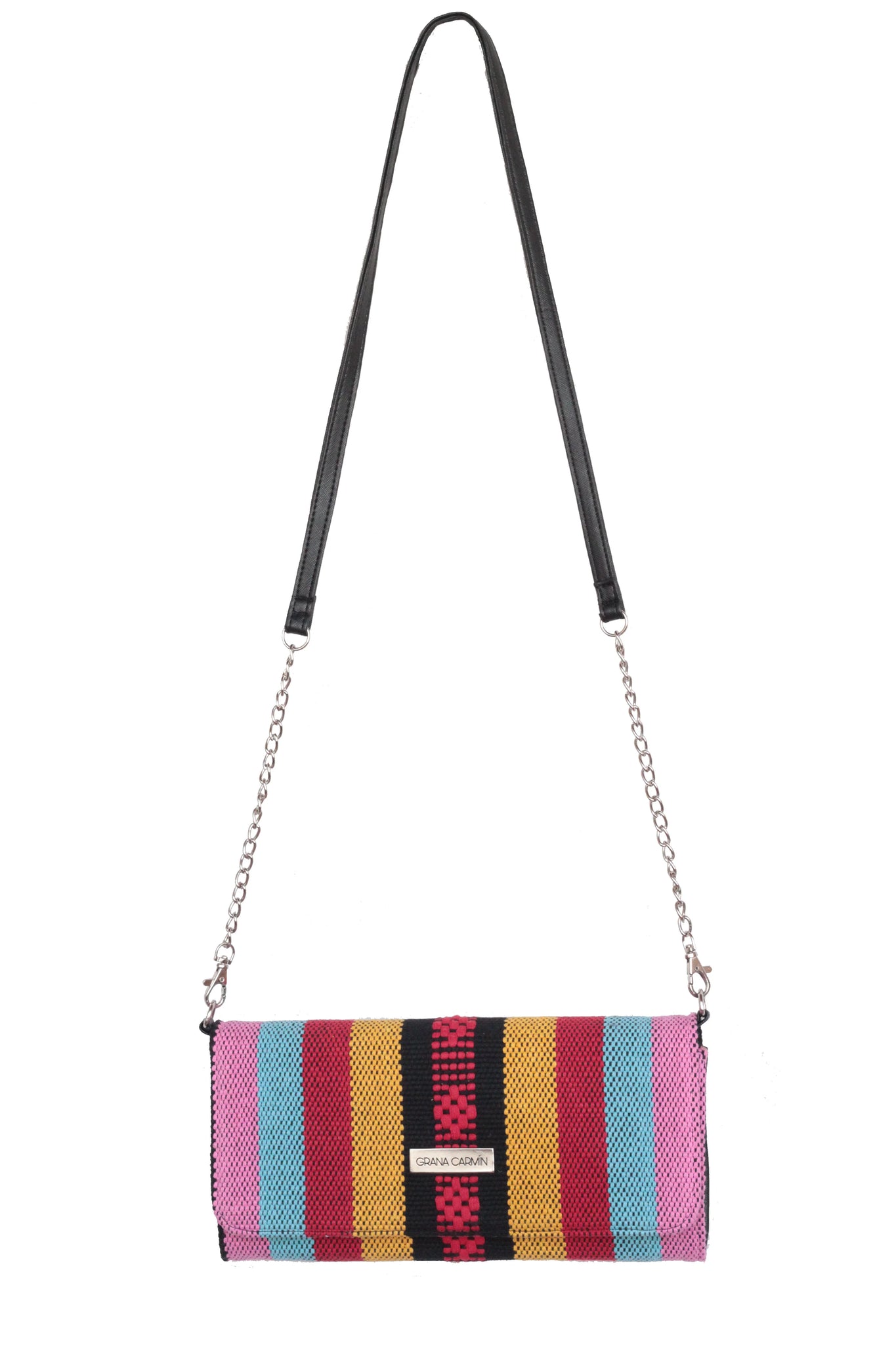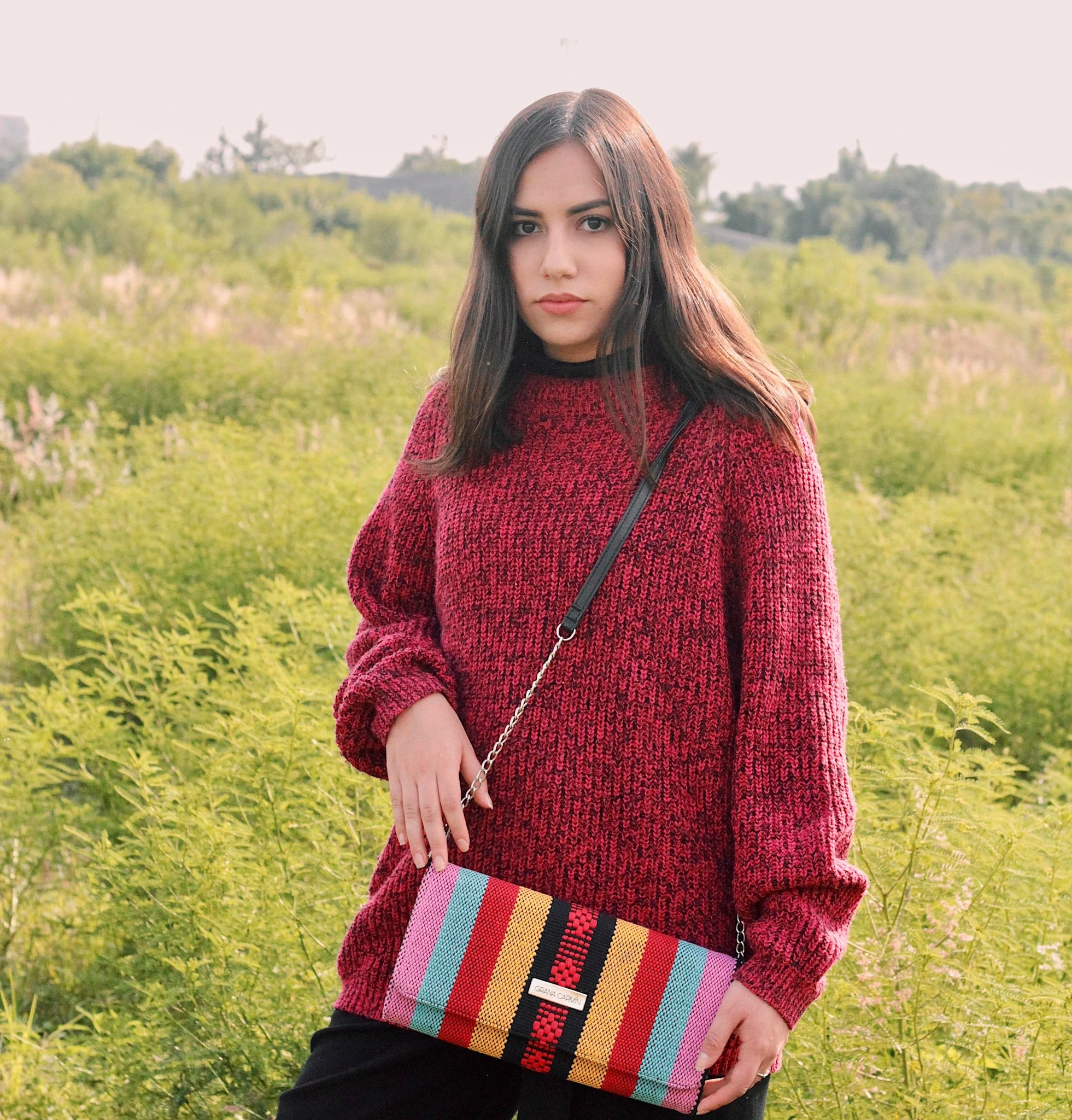 Handmade clutch, made with the traditional backstrap loom technique, and vegan leather. Black, pink, blue, red and yellow colors.
