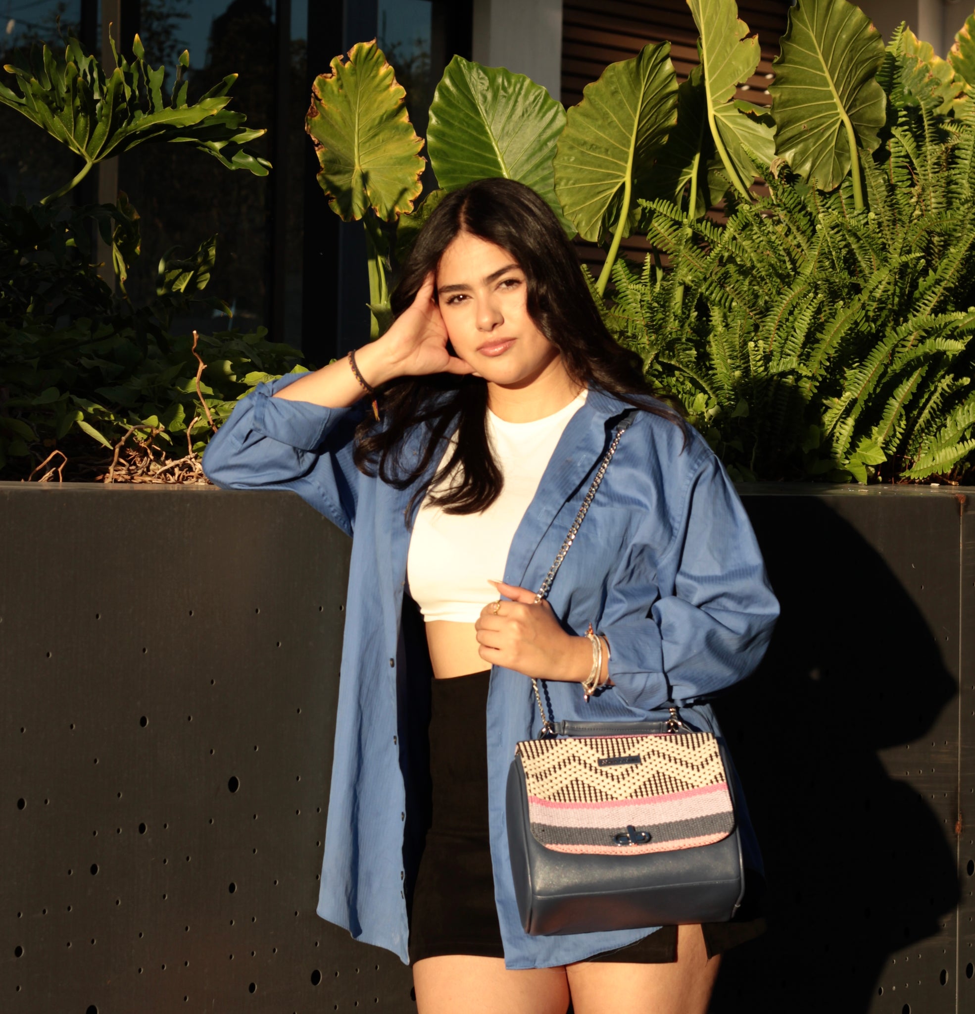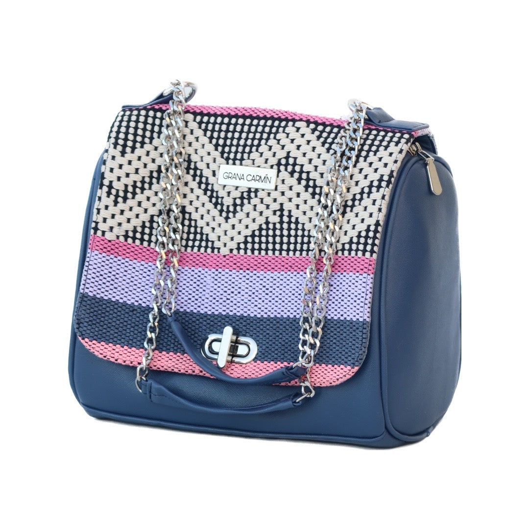 Handmade bag, made with the traditional backstrap loom technique, and vegan leather. Blue, pink, beige and violet colors.