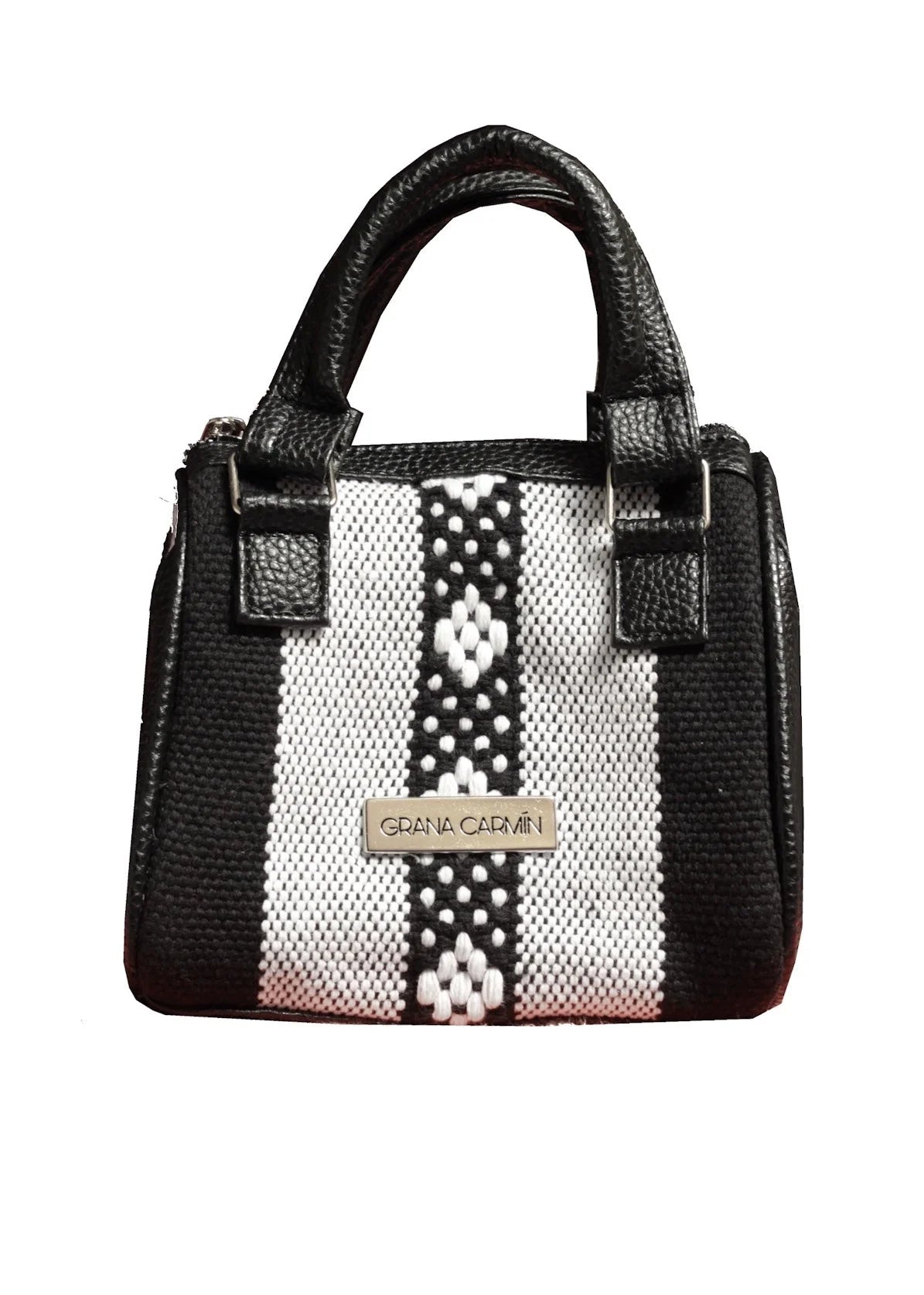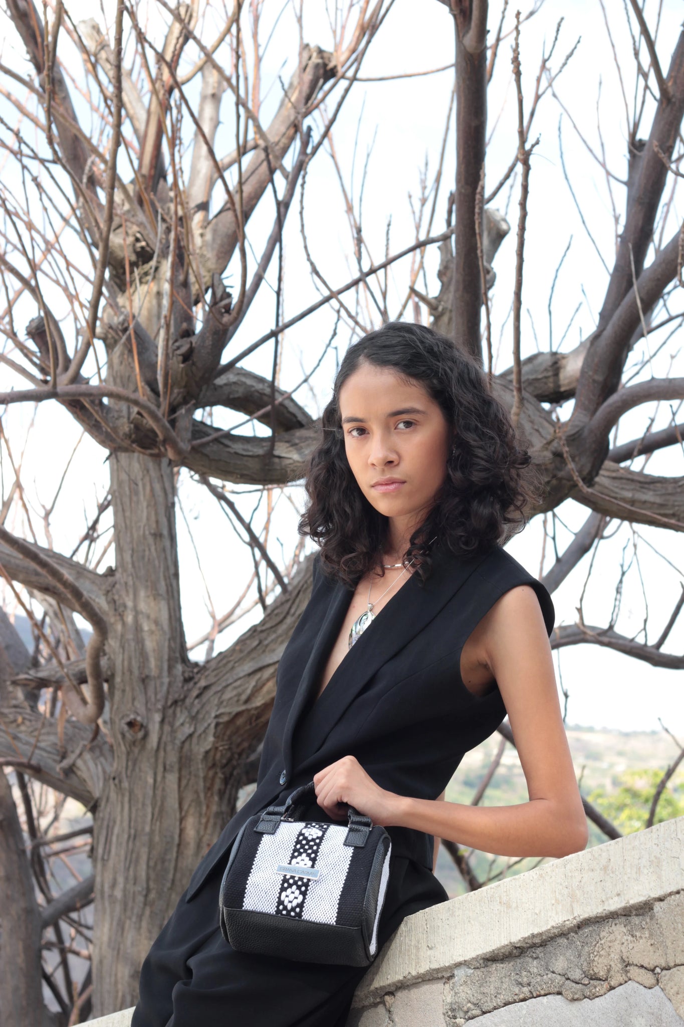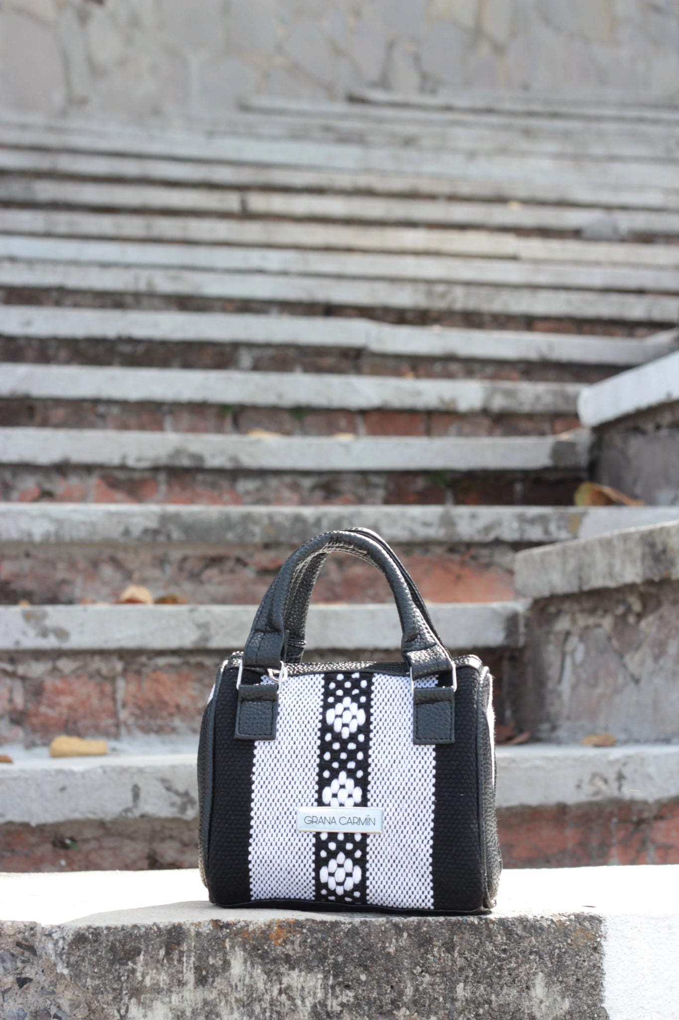 Mini artisan bag, made with the traditional backstrap loom technique and vegan leather. Black color. Additional adjustable strap.