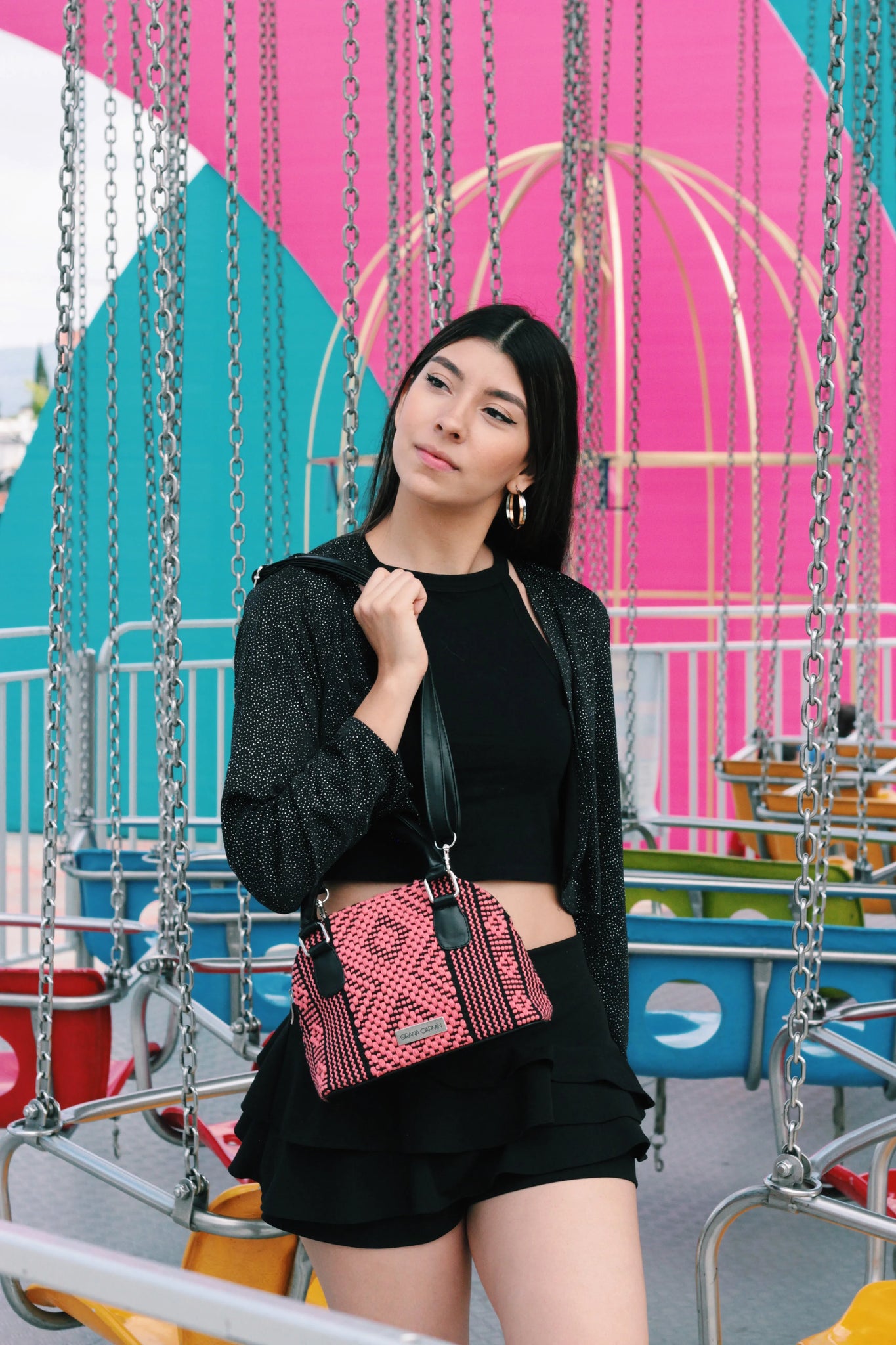 Handmade bag, made with the traditional backstrap loom technique and vegan leather. Black and pink colors.
