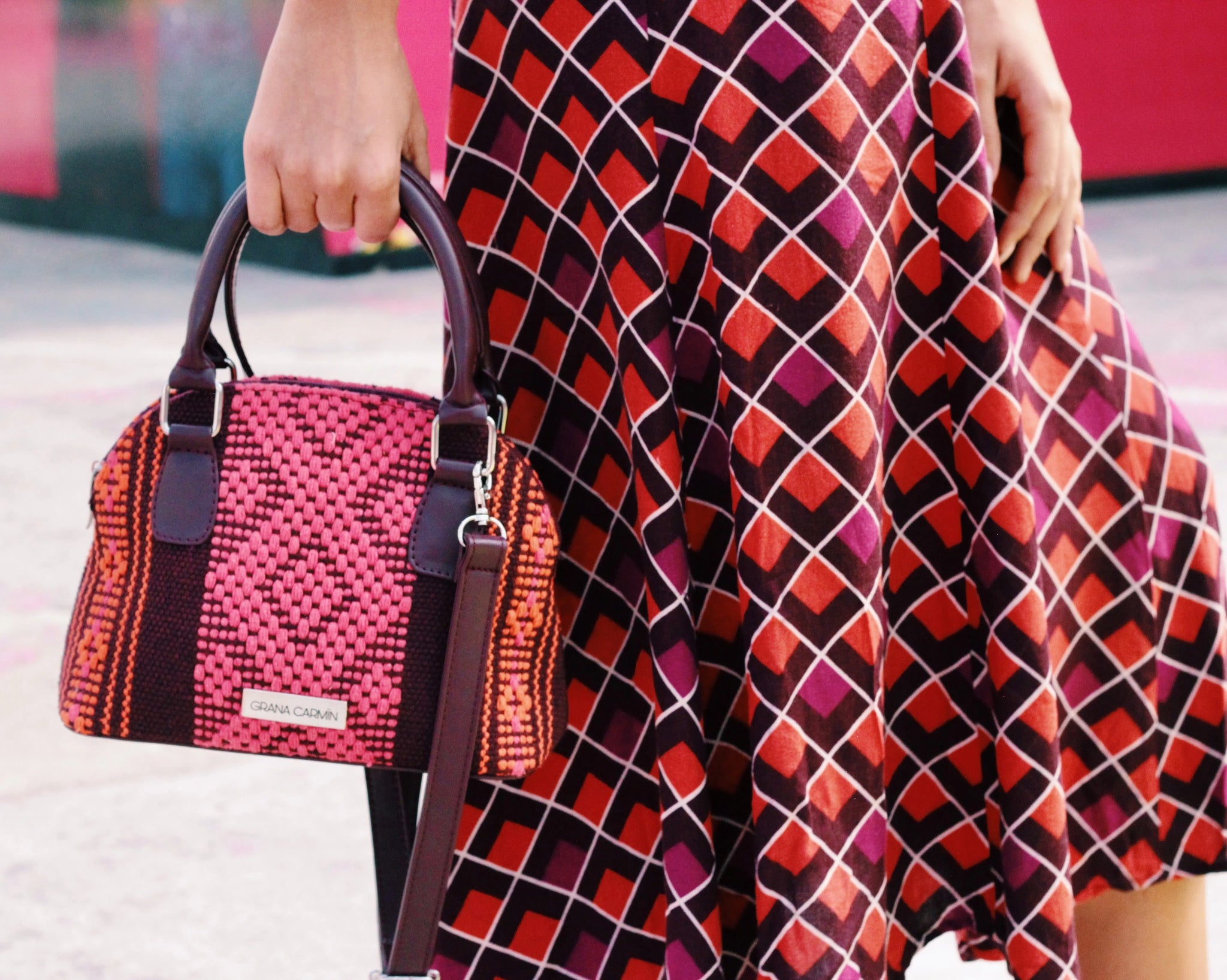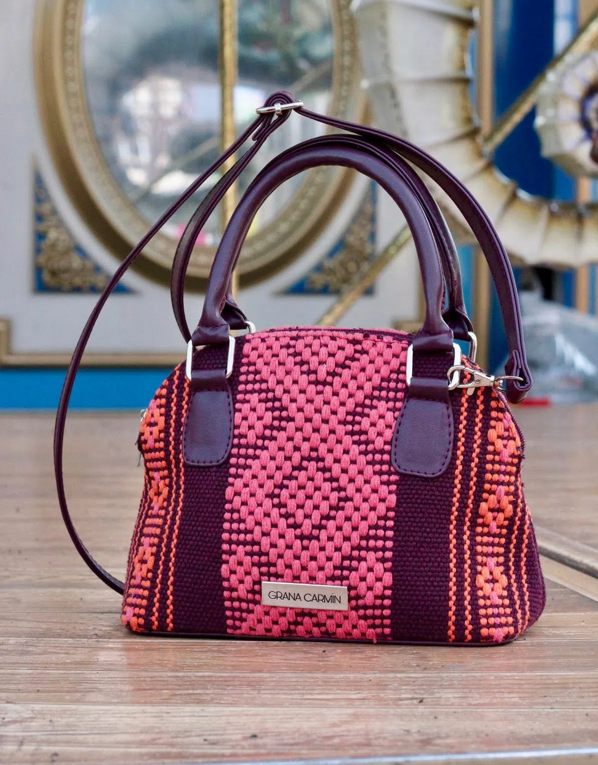 Handmade bag, made with the traditional backstrap loom technique and vegan leather. Burgundy violet, pink and orange colors.