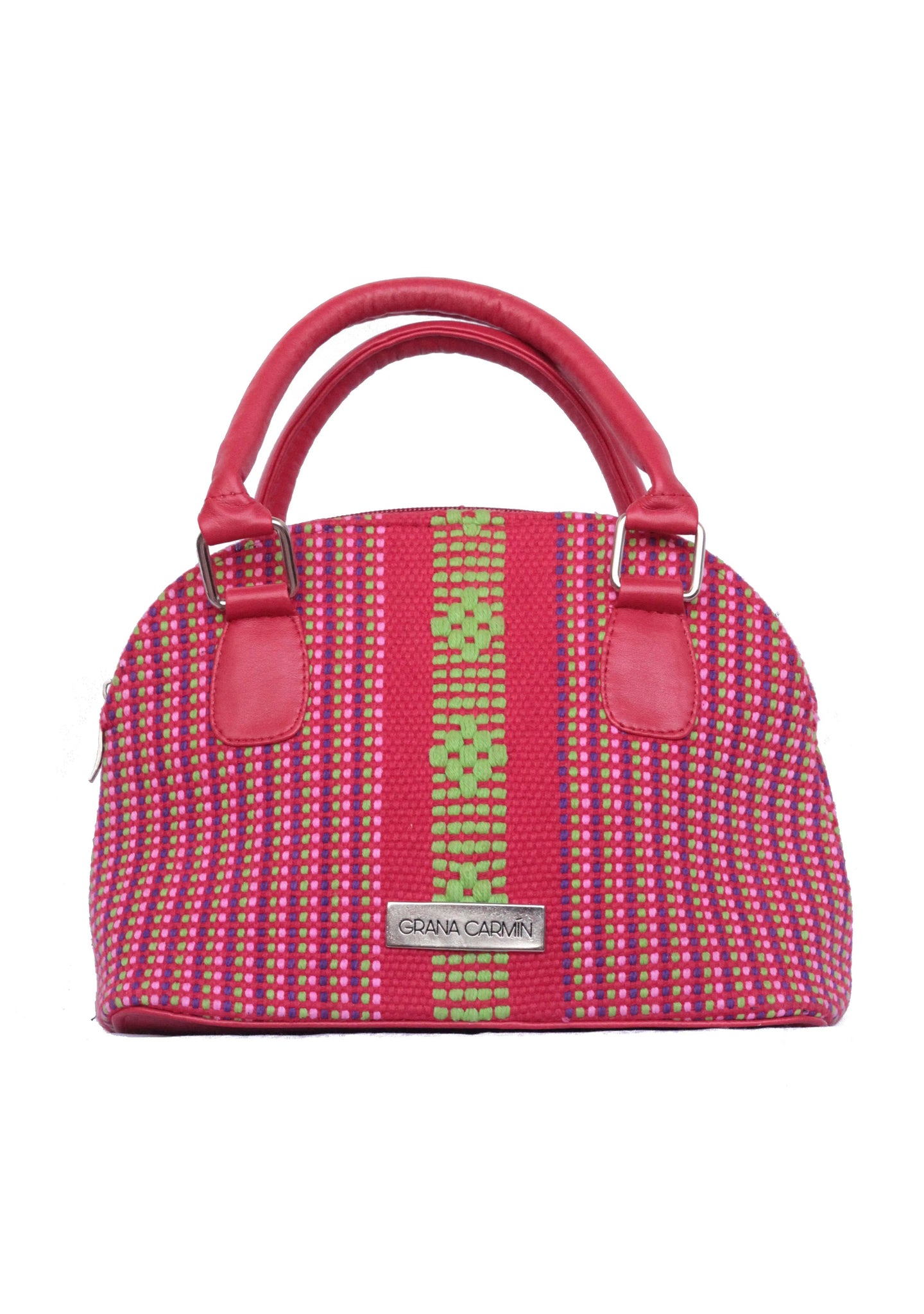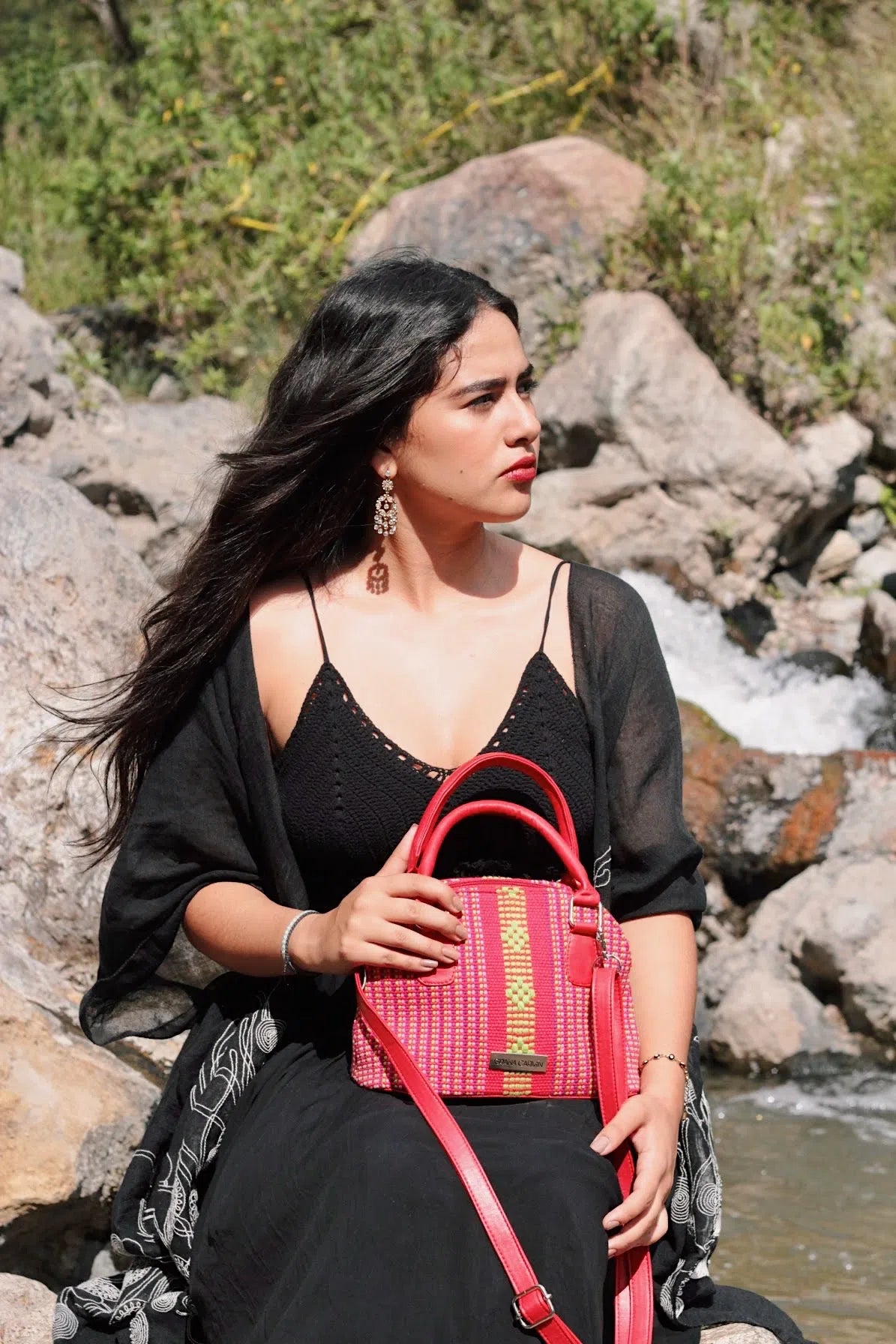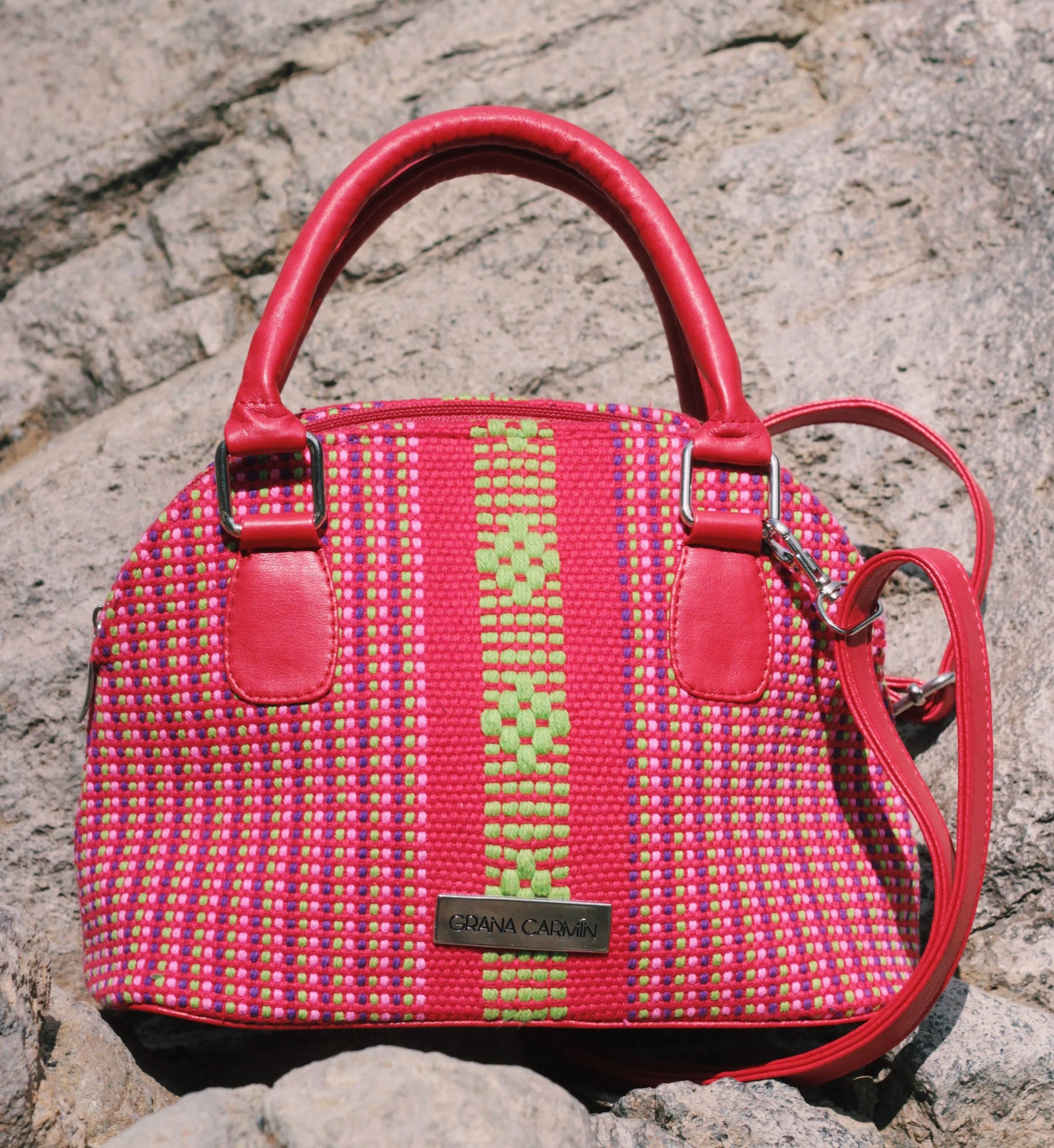 Handmade bag, made with the traditional backstrap loom technique and vegan leather. Red, green, purple and pink colors.
