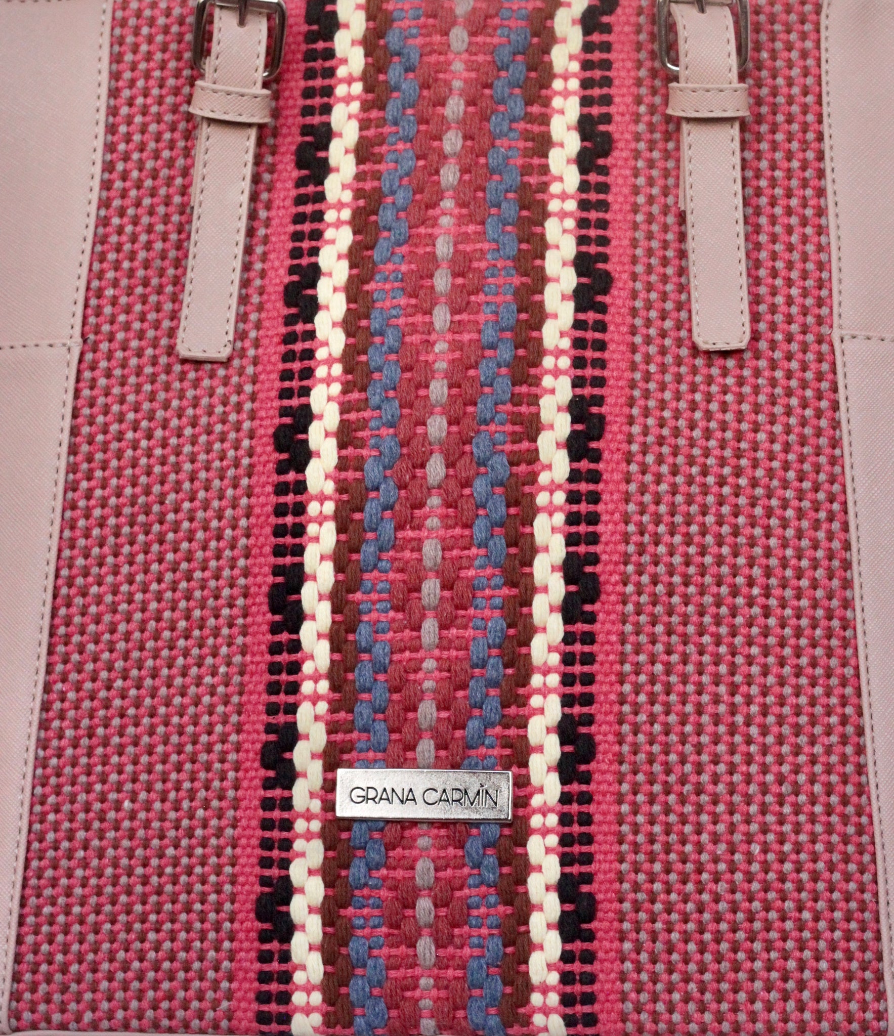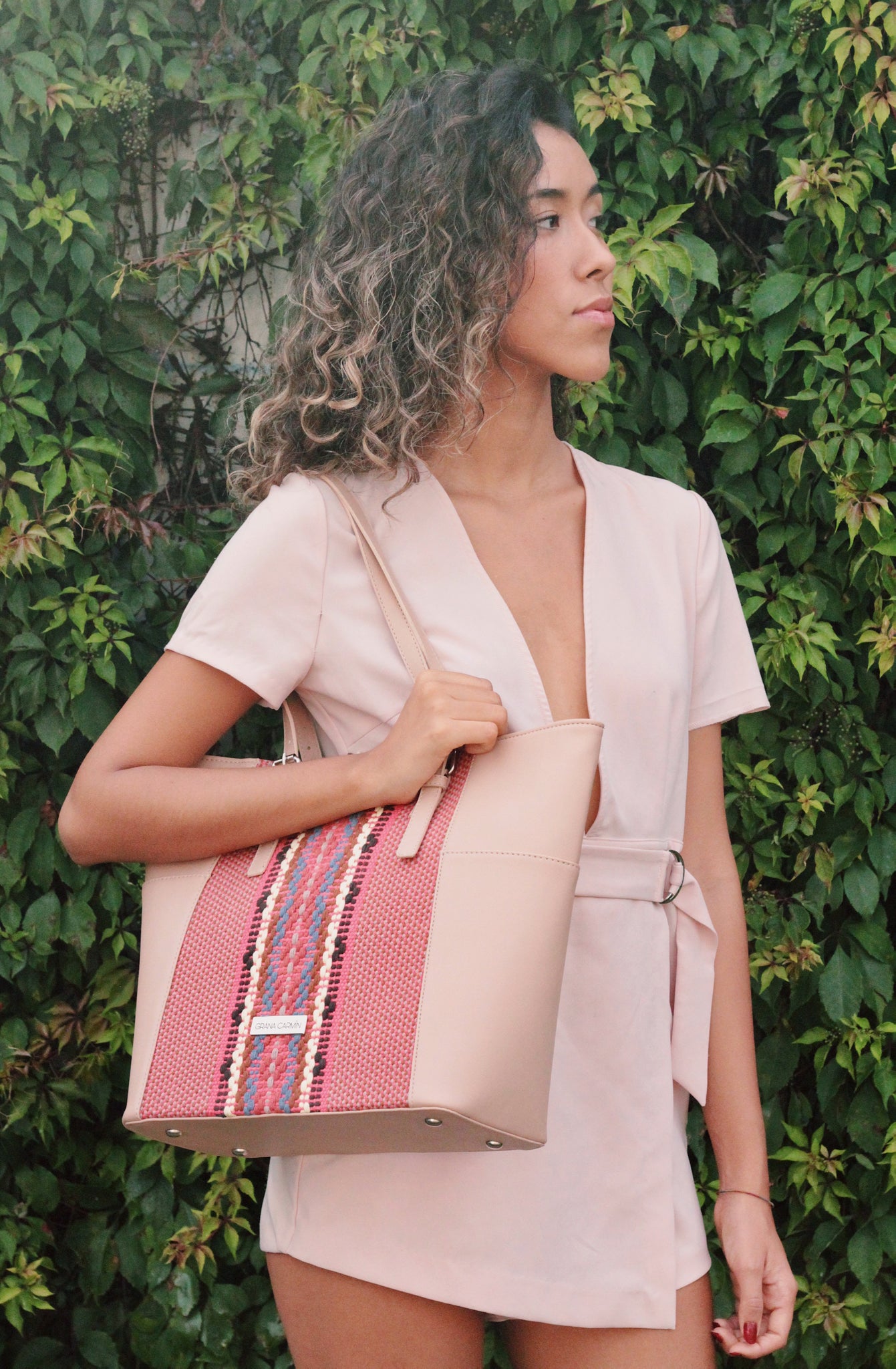 Tote handmade bag, made with the traditional backstrap loom technique and vegan leather. Nude, pink, black, white, brown, blue, burgundy, and grey colors.